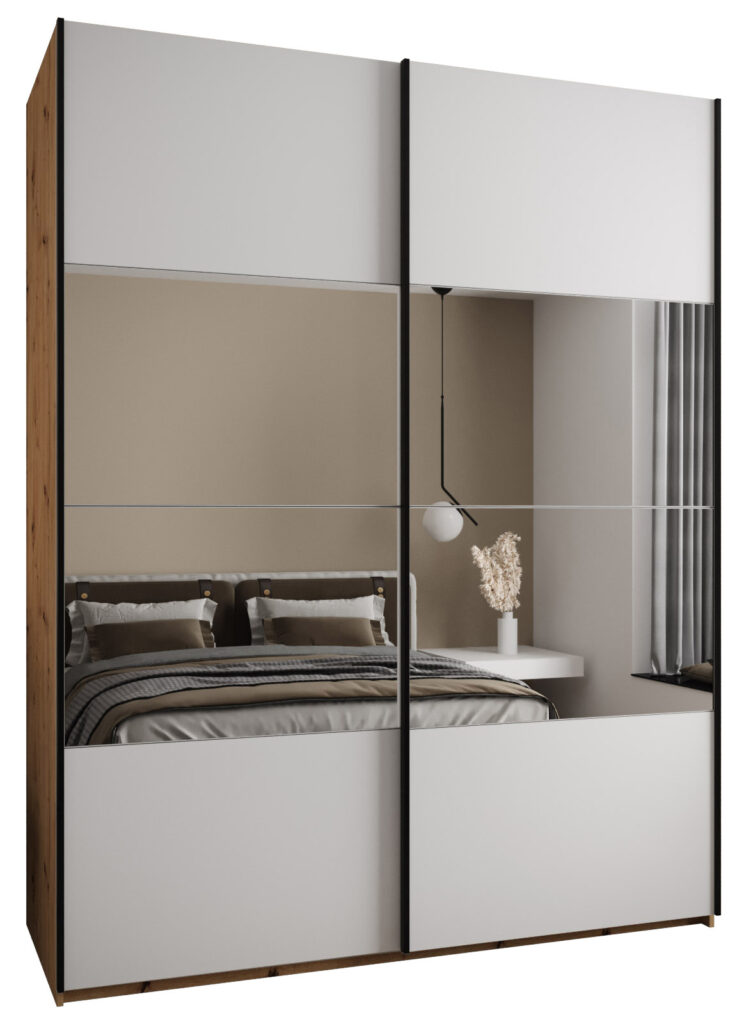 Kolekcja szaf Lux to doskonałe rozwiązanie dla osób, które cenią sobie możliwość dostosowania mebla do własnych preferencji. Szafa przesuwna o imponującej wysokości 245,5 cm to propozycja dla tych, którzy szukają funkcjonalności w połączeniu z nowoczesnym designem. Wysoka jakość wykonania oraz niemiecki system przesuwny Hettich gwarantują wygodę i trwałość użytkowania. Dodatkowo, szeroka gama kolorystyczna pozwala na stworzenie idealnego mebla, który będzie doskonale pasować do wystroju wnętrza. Szafa oferuje wiele dostępnych szerokości, co daje jeszcze większe możliwości aranżacyjne. To propozycja dla osób, które cenią sobie elegancję i jakość w jednym produkcie – dąb artisan w połączeniu z białym matem i czarnymi akcentami to wyjątkowe połączenie kolorów, które nadają meblowi indywidualny charakter. Szafa Lux to inwestycja, która z pewnością będzie cieszyć oczy przez wiele lat użytkowania.